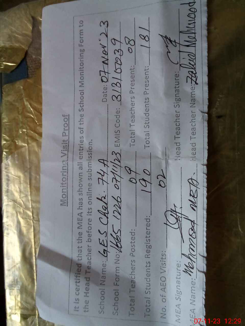 | EMIS Code: 31310039 | Name of School: GES CHAK NO 74/A FEROZA | |||