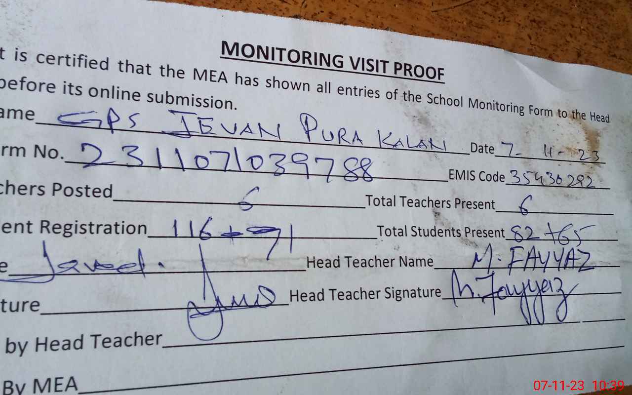 | Attendance Register | Head Teacher | MEA with School | Visit Proof |
