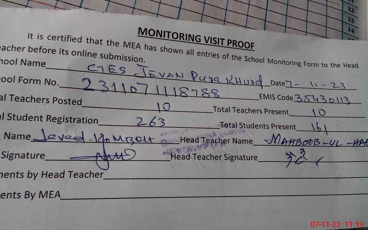 | Attendance Register | Head Teacher | MEA with School | Visit Proof |