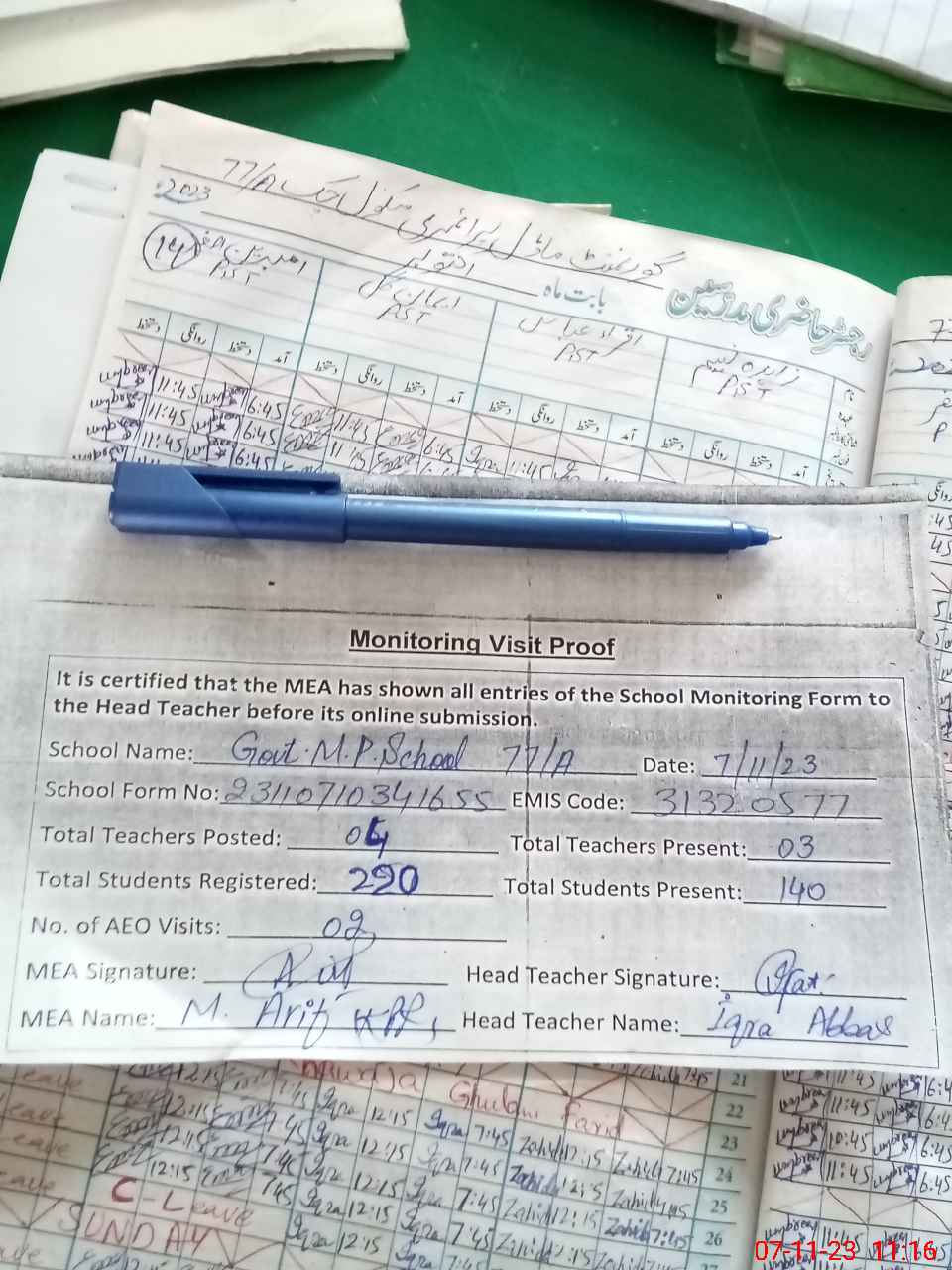 | Attendance Register | Head Teacher | MEA with School | Visit Proof |