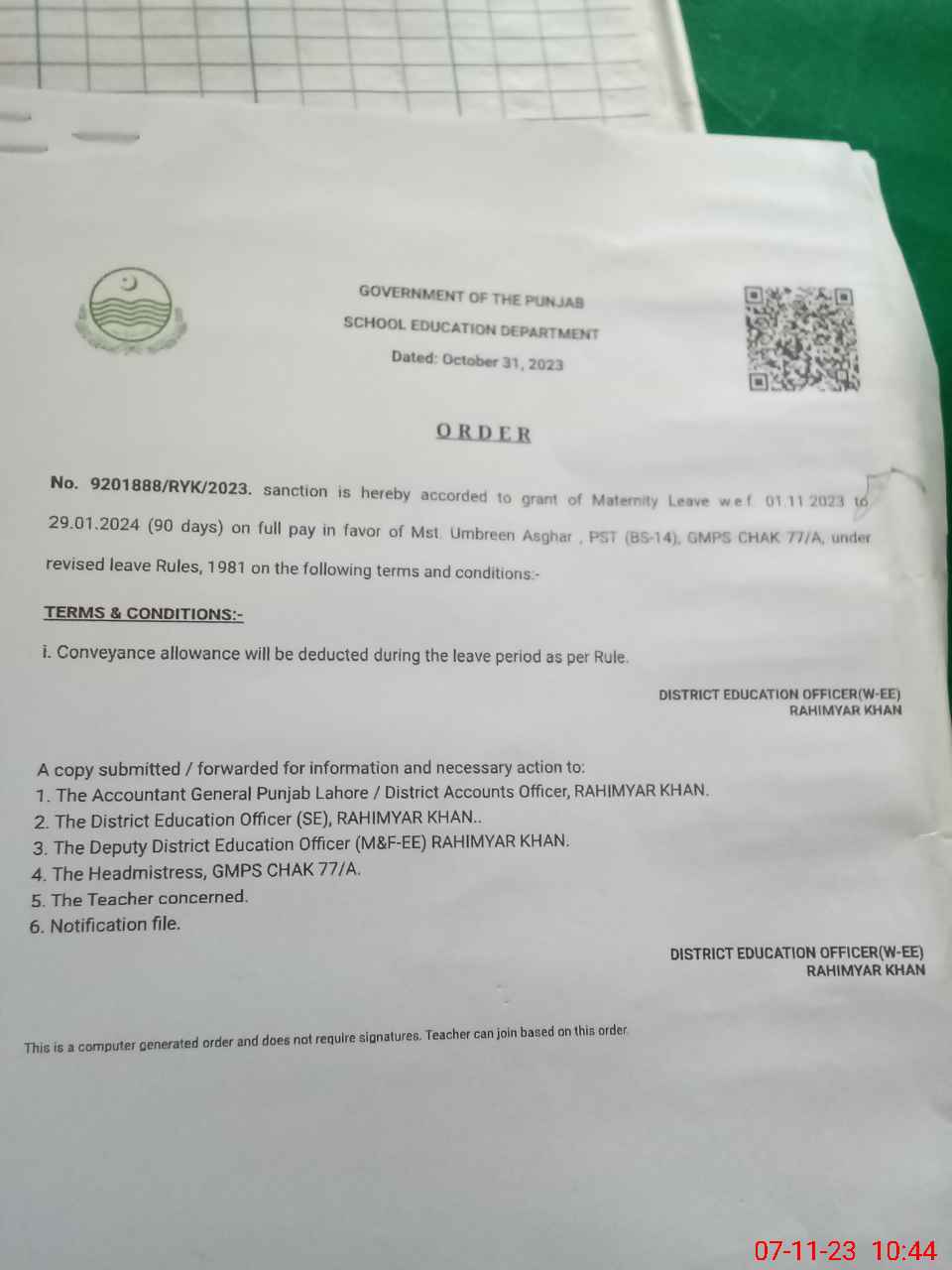 | Name: Um**** As**** Designation: (School Headmaster's/Headmistress's) PST Phone/Cell Number: 03**** |
