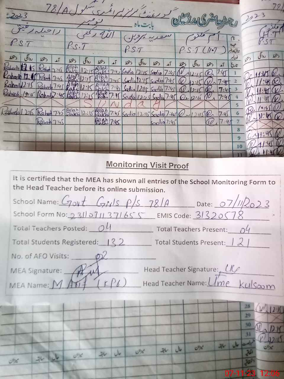 | Attendance Register | Head Teacher | MEA with School | Visit Proof |