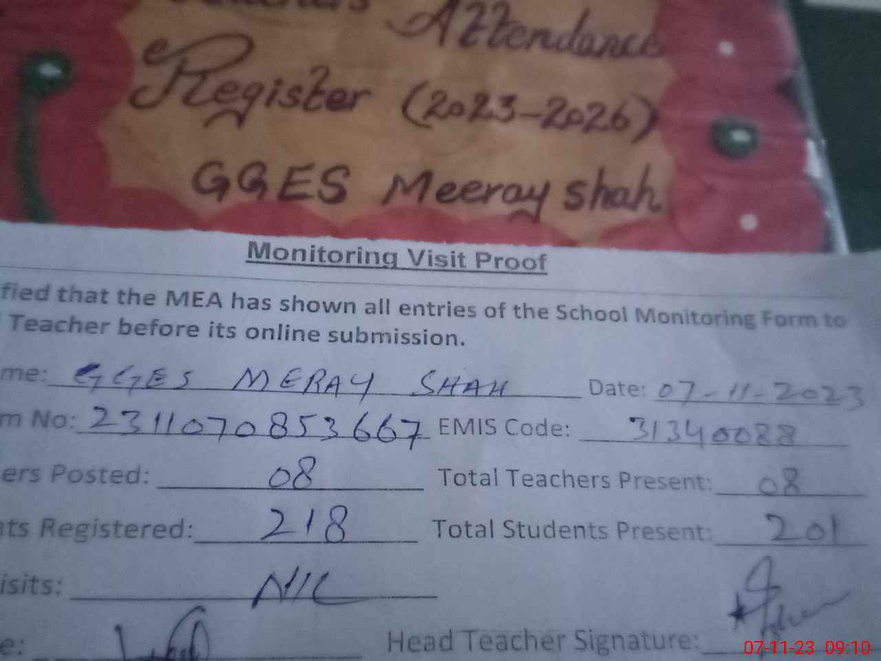 | Attendance Register | Head Teacher | MEA with School | Visit Proof |