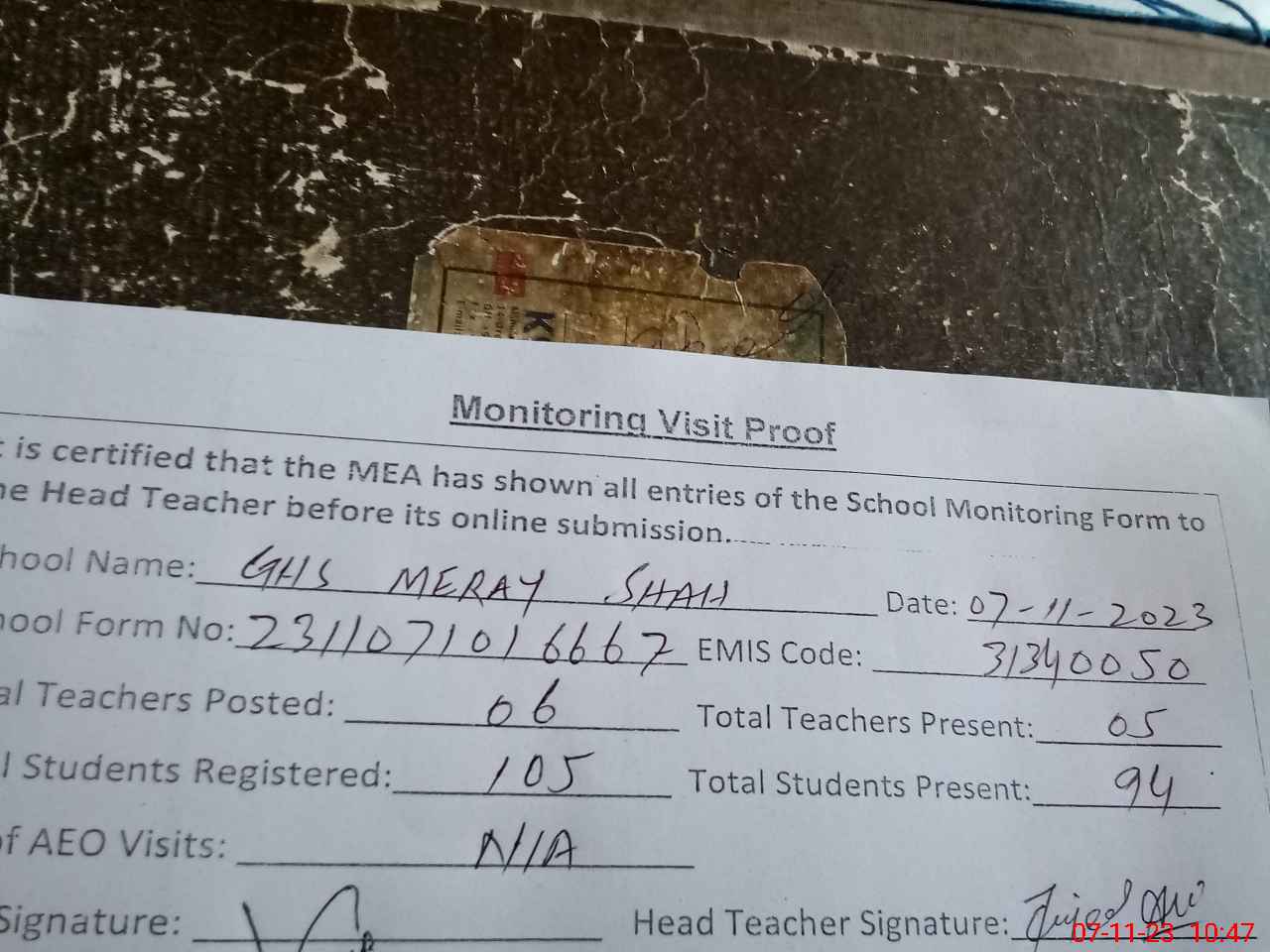 | EMIS Code: 31340050 | Name of School: GHS MERAY SHAH | |||