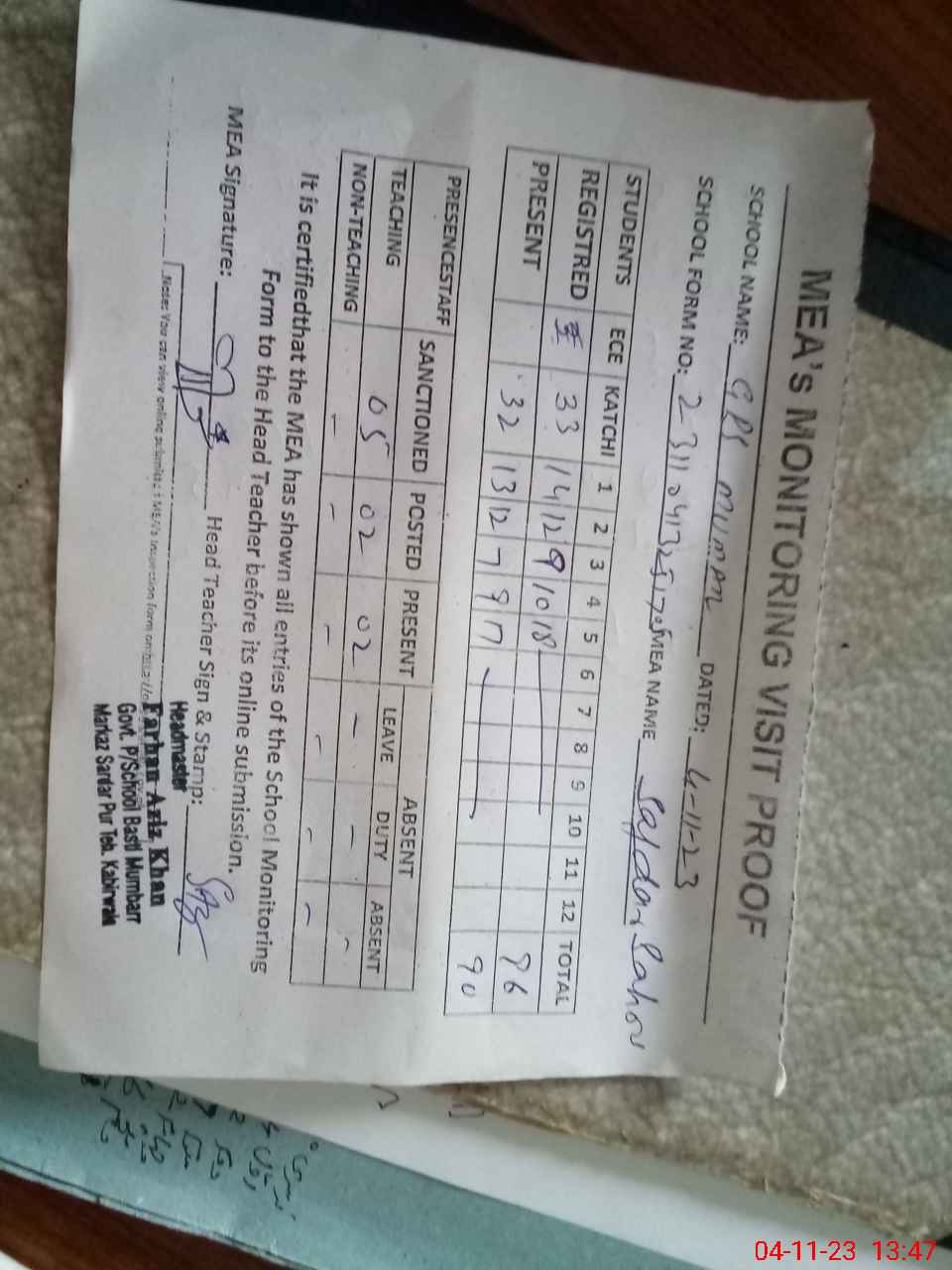 | Attendance Register | Head Teacher | MEA with School | Visit Proof |