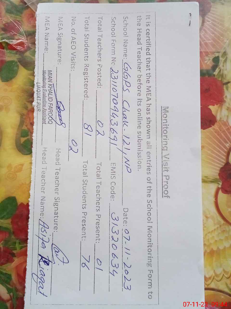 | EMIS Code: 31320634 | Name of School: GGPS CHAK NO.121/NP | |||