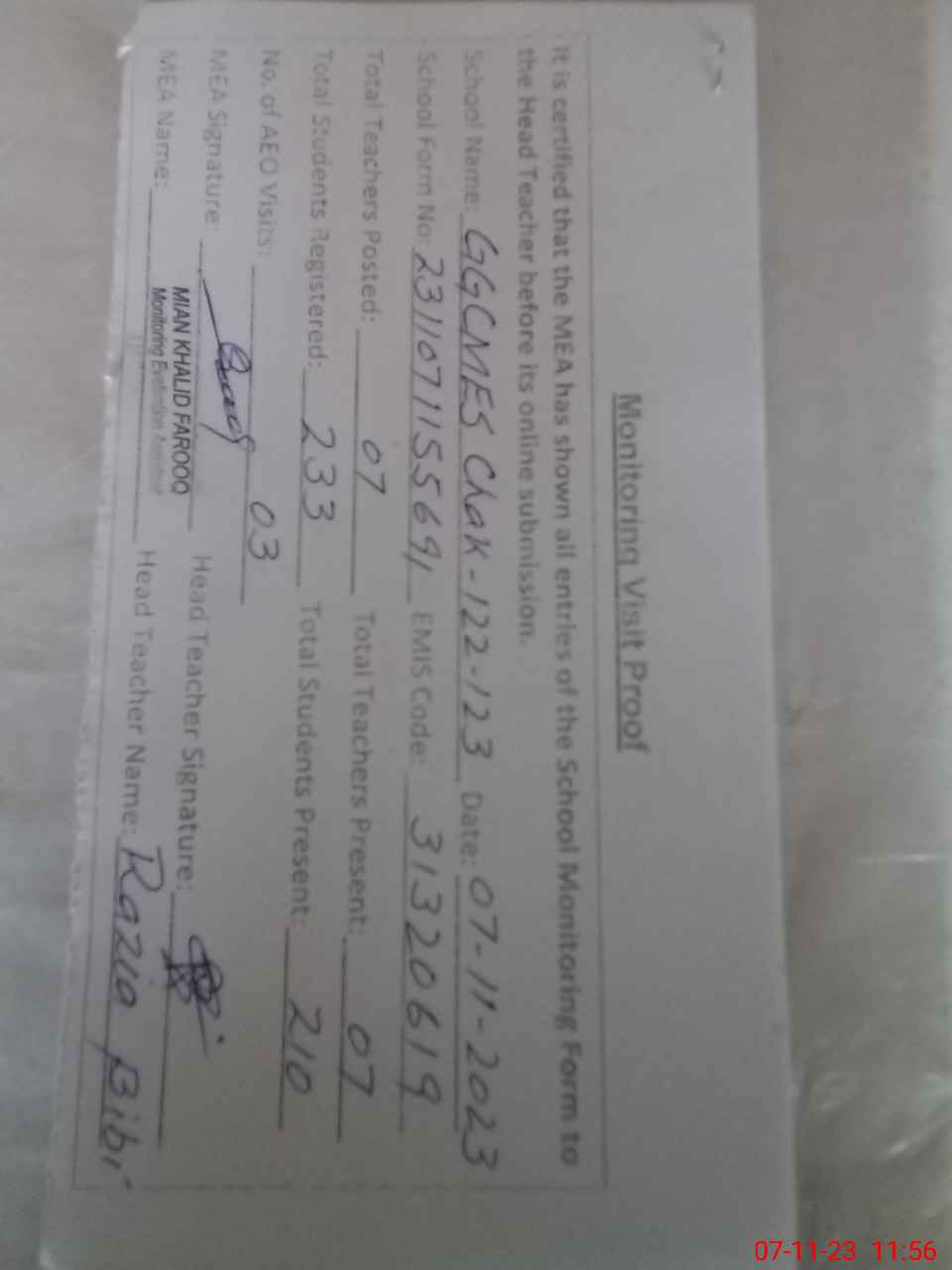 | Attendance Register | Head Teacher | MEA with School | Visit Proof |