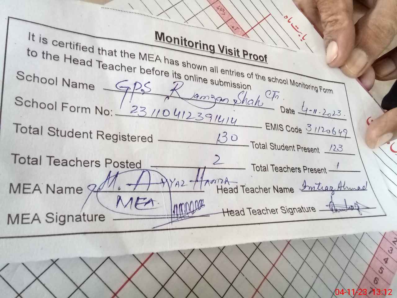 | Attendance Register | Head Teacher | MEA with School | Visit Proof |