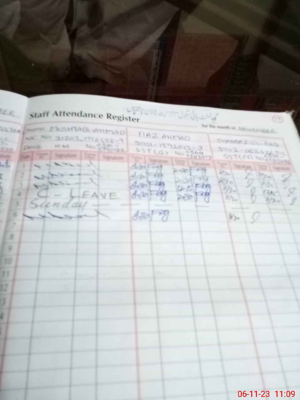 | CNIC | Full Name | Designation | R/C | Absence During Last Calender Month |