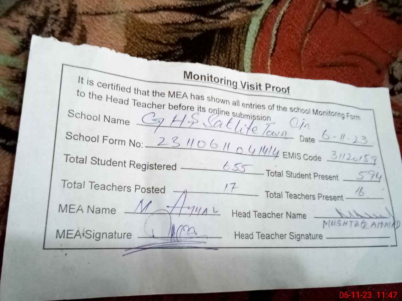 | Attendance Register | Head Teacher | MEA with School | Visit Proof |