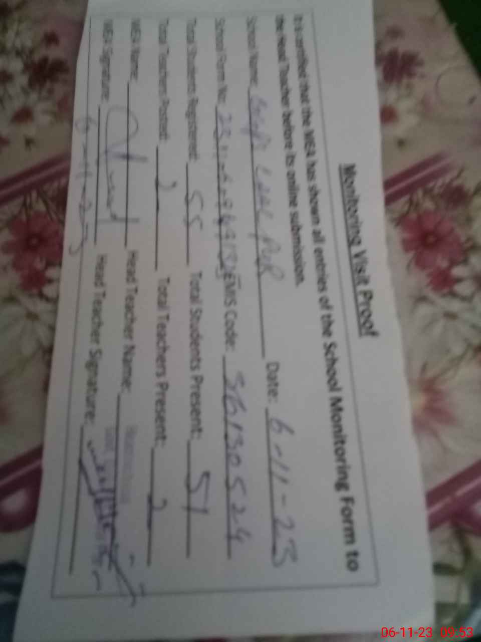 | Attendance Register | Head Teacher | MEA with School | Visit Proof |