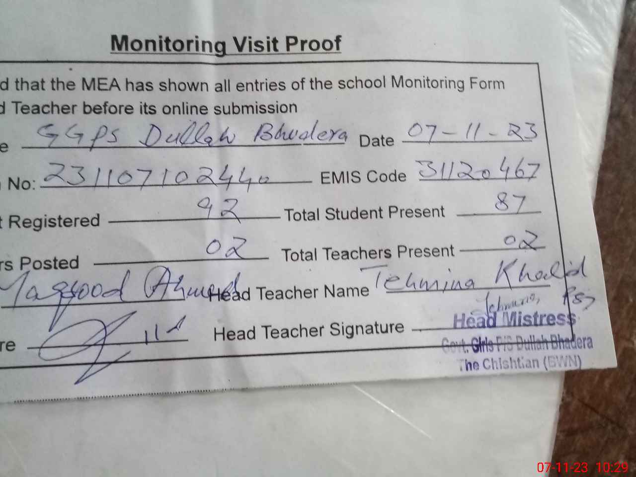 | Attendance Register | Head Teacher | MEA with School | Visit Proof |