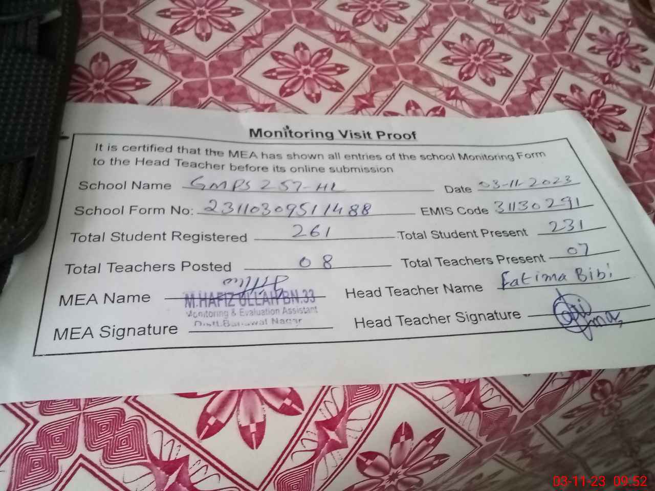 | Attendance Register | Head Teacher | MEA with School | Visit Proof |