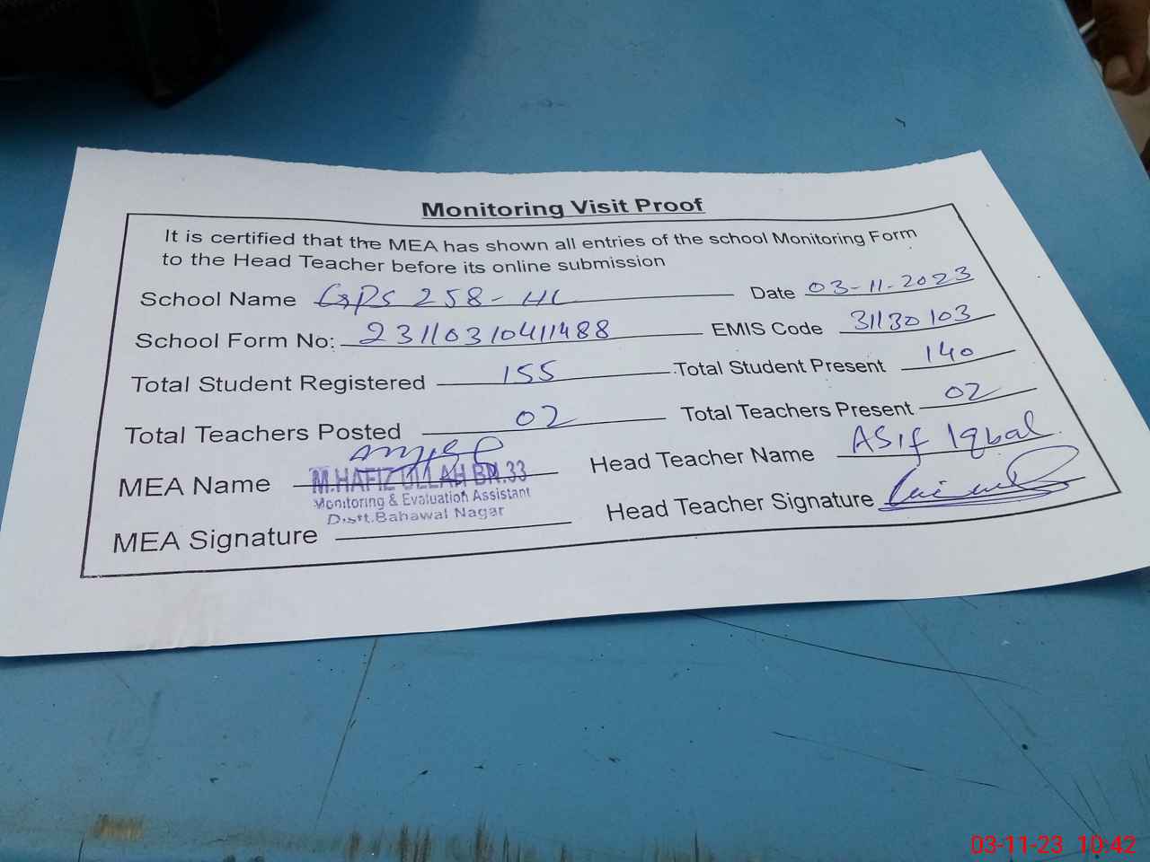 | Attendance Register | Head Teacher | MEA with School | Visit Proof |