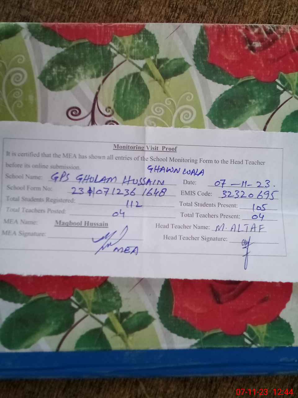 | Attendance Register | Head Teacher | MEA with School | Visit Proof |
