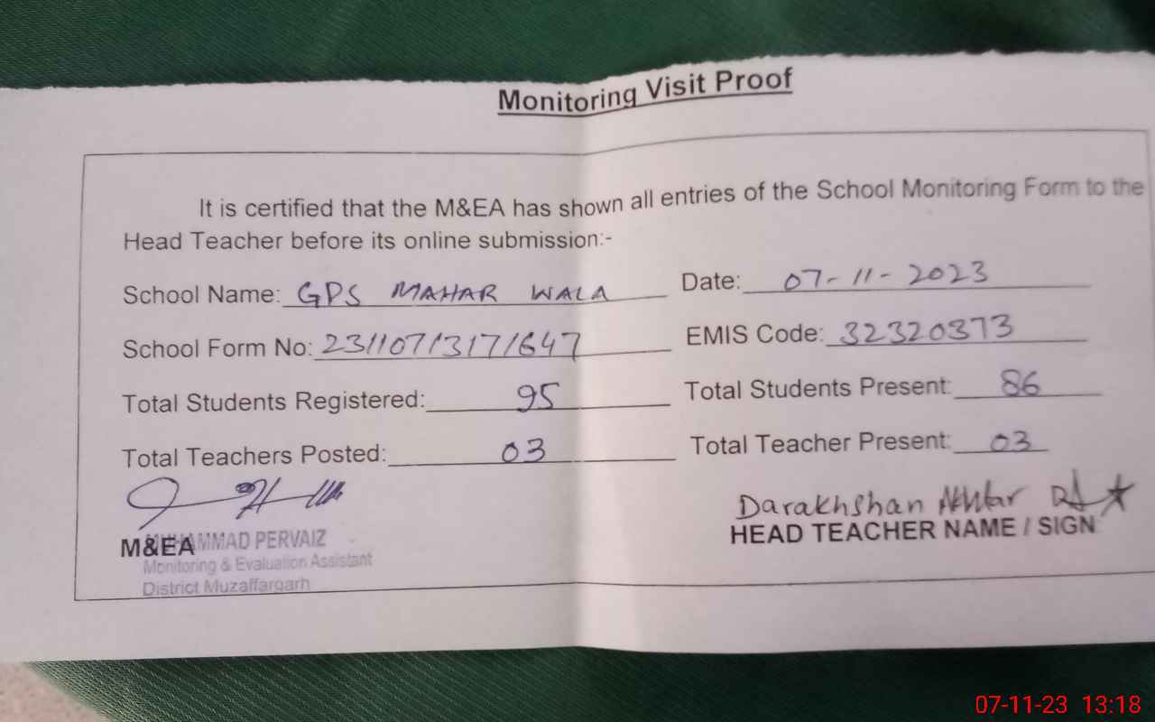 | EMIS Code: 32320373 | Name of School: GGPS MEHAR WALA | |||