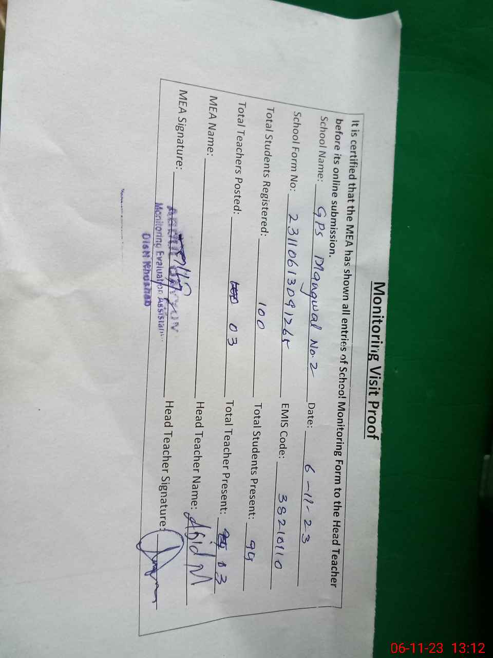 | Attendance Register | Head Teacher | MEA with School | Visit Proof |