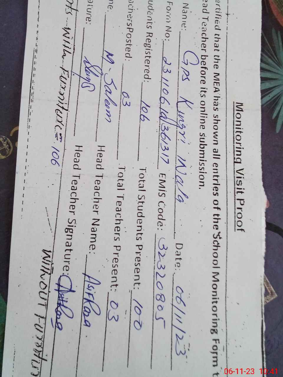| Attendance Register | Head Teacher | MEA with School | Visit Proof |