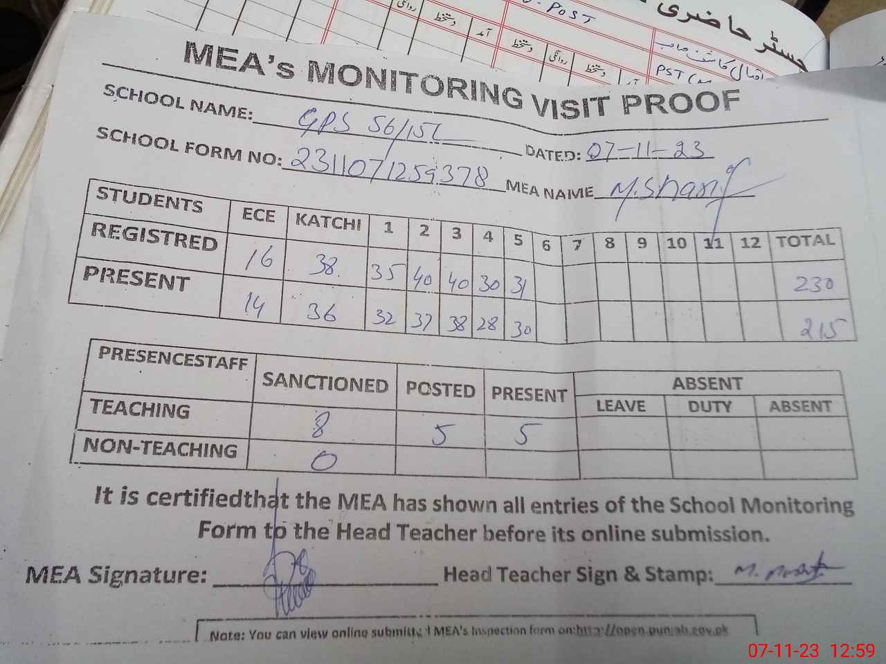 | Attendance Register | Head Teacher | MEA with School | Visit Proof |