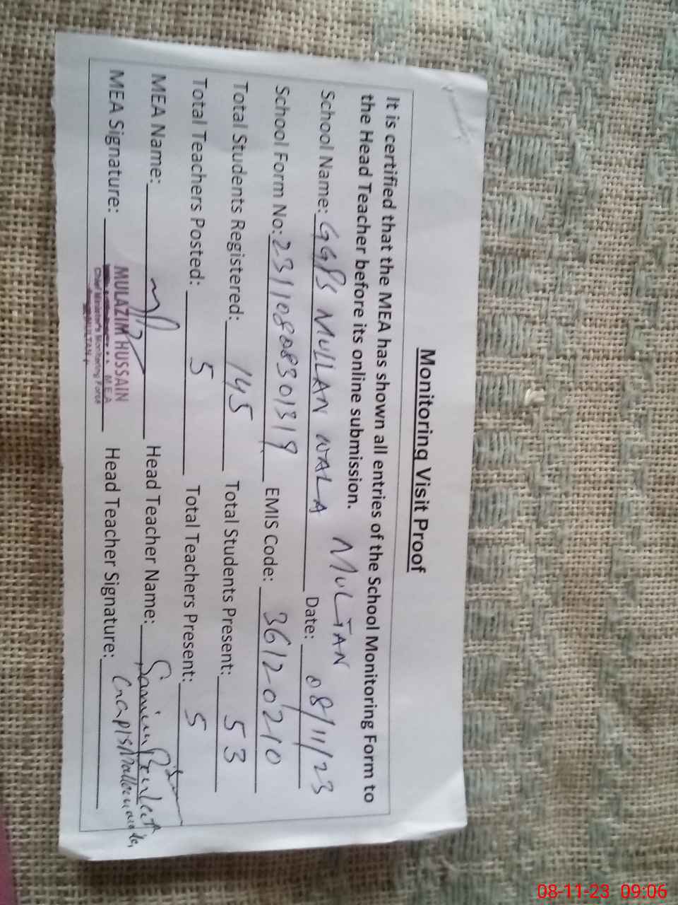 | EMIS Code: 36120210 | Name of School: GGPS MULLAN WALA SHUJABAD | |||