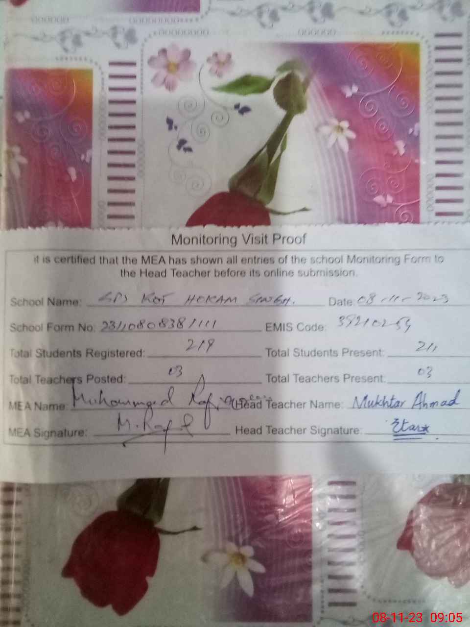 | Attendance Register | Head Teacher | MEA with School | Visit Proof |