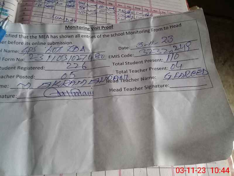 | EMIS Code: 32320249 | Name of School: GPS CHAK NO.607 TDA | |||