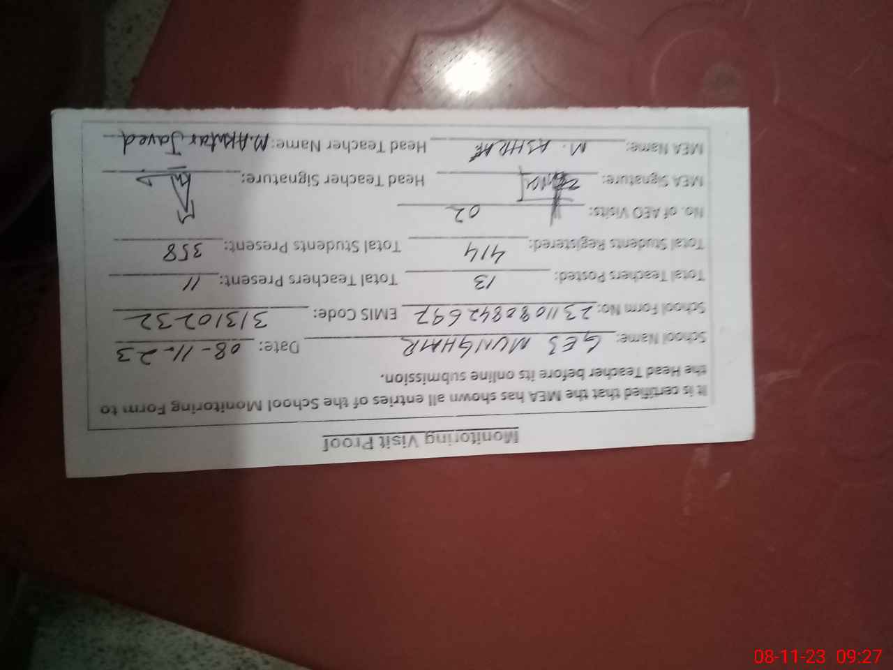 | Attendance Register | Head Teacher | MEA with School | Visit Proof |