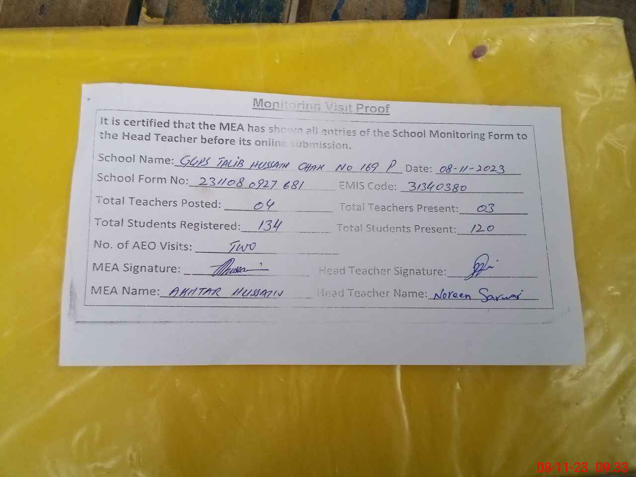 | Attendance Register | Head Teacher | MEA with School | Visit Proof |