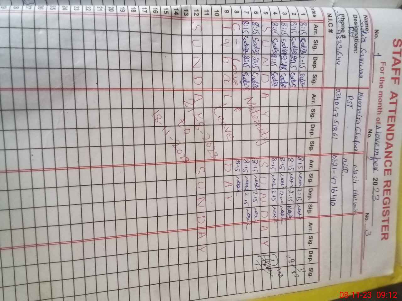 | CNIC | Full Name | Designation | R/C | Absence During Last Calender Month |