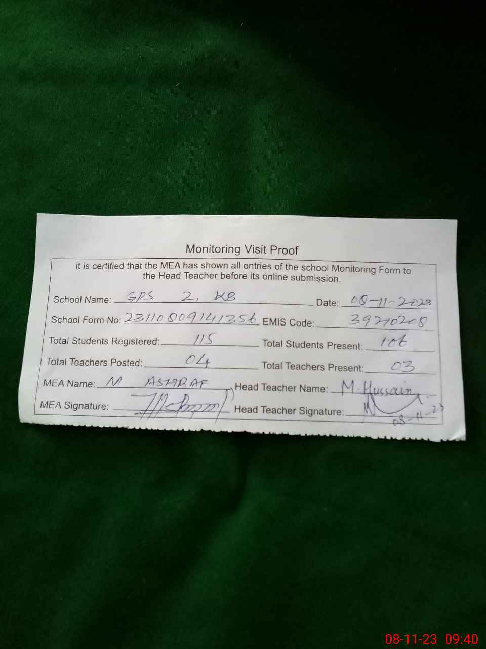 | Attendance Register | Head Teacher | MEA with School | Visit Proof |