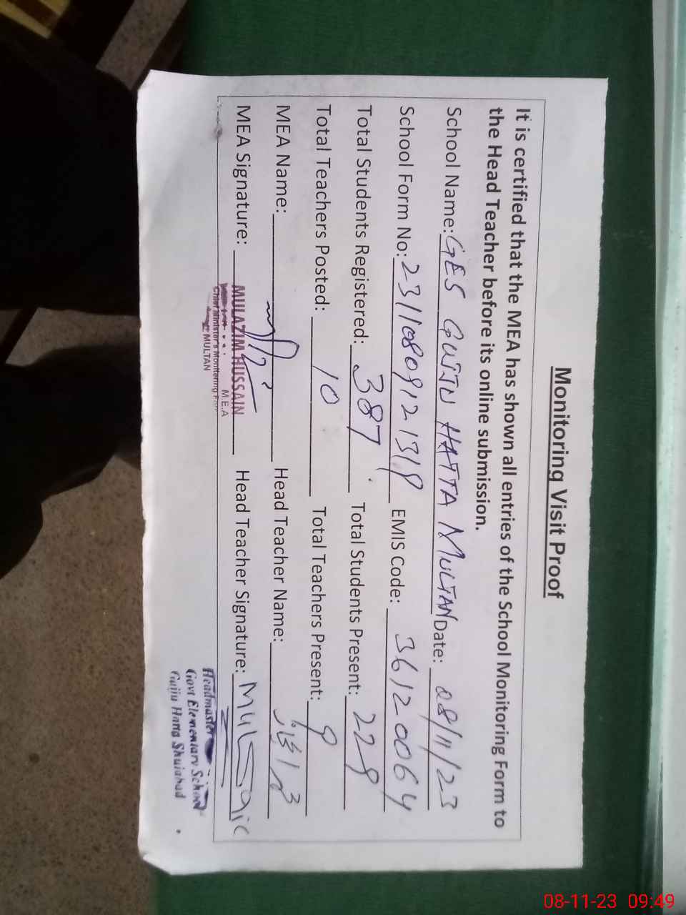 | Attendance Register | Head Teacher | MEA with School | Visit Proof |