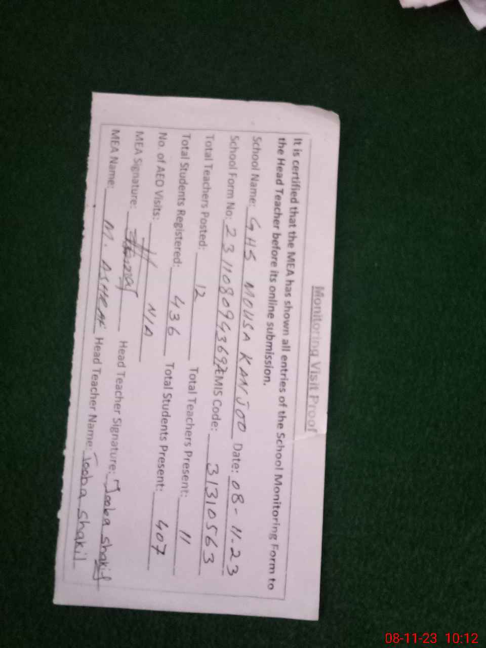 | Attendance Register | Head Teacher | MEA with School | Visit Proof |