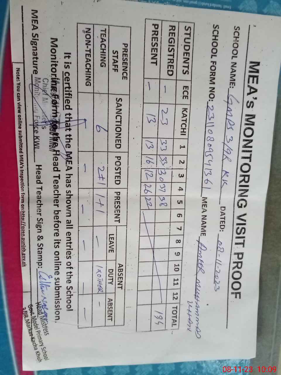 | Monitoring Date: 08-11-2023 | Start Time: 08-11-2023 09:23 AM | End Time: 08-11-2023 10:13 AM | Name of MEA: Am**** Mu**** Kh**** | |