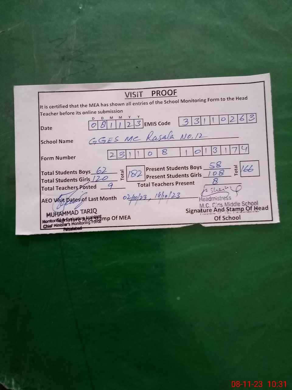 | Attendance Register | Head Teacher | MEA with School | Visit Proof |