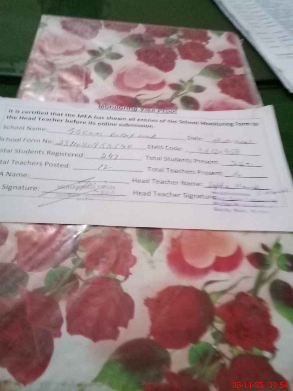 | Attendance Register | Head Teacher | MEA with School | Visit Proof |