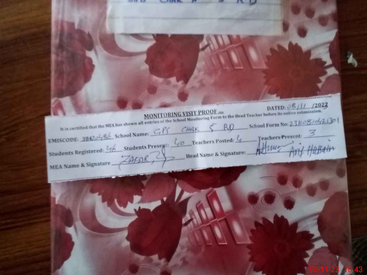 | Attendance Register | Head Teacher | MEA with School | Visit Proof |