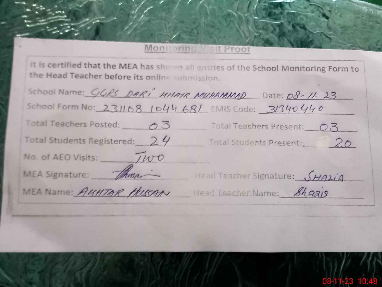 | Attendance Register | Head Teacher | MEA with School | Visit Proof |