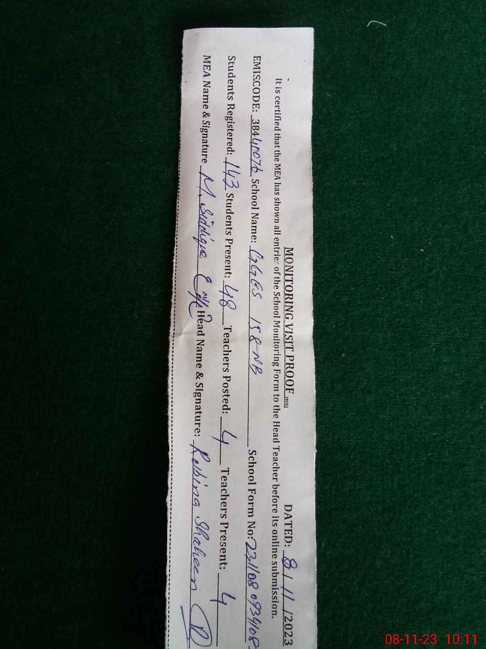 | Monitoring Date: 08-11-2023 | Start Time: 08-11-2023 09:34 AM | End Time: 08-11-2023 10:15 AM | Name of MEA: MU**** SI**** | |