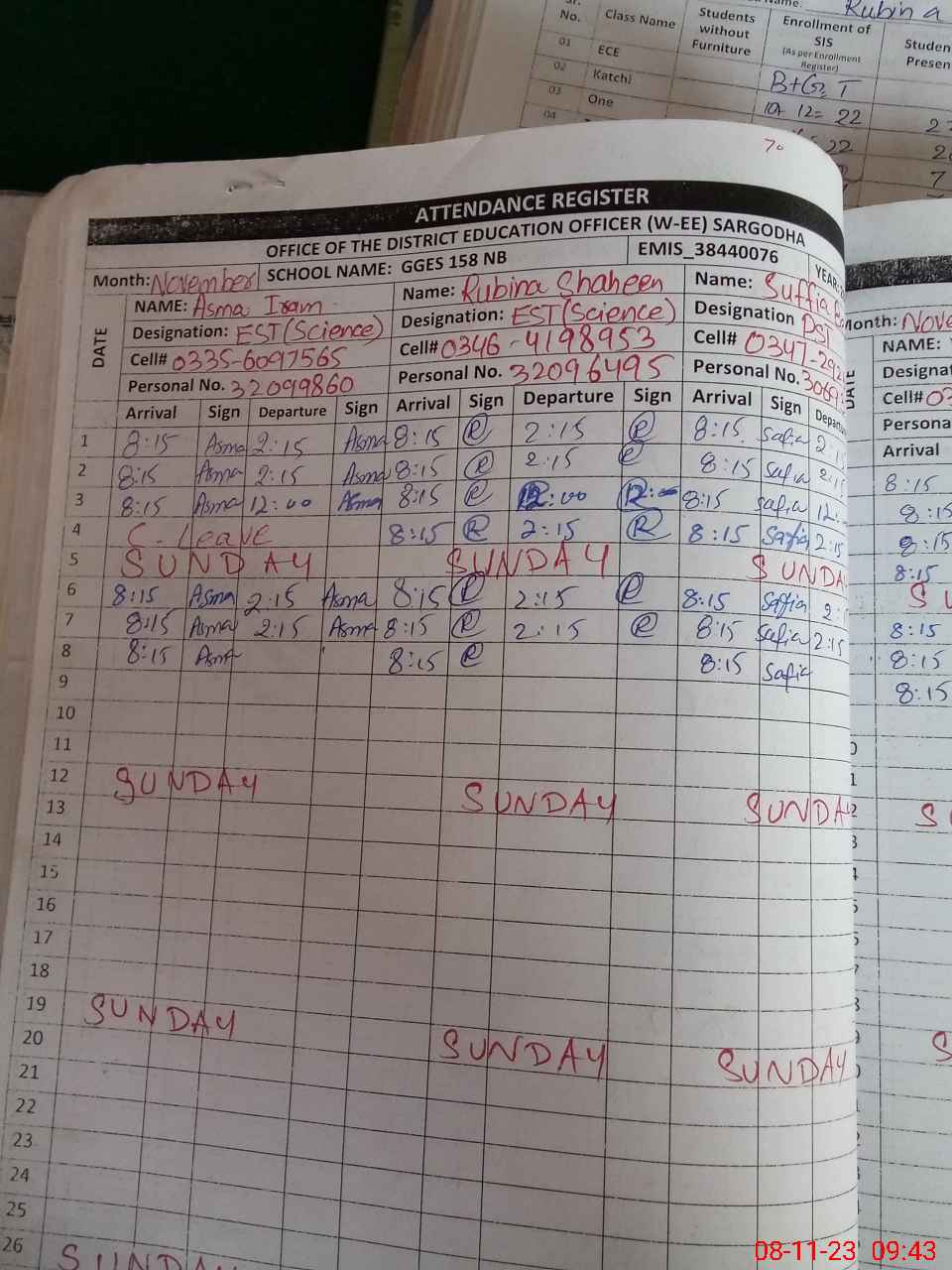 | Name: As**** Ir**** Designation: (School Headmaster's/Headmistress's) EST SCI Phone/Cell Number: 03**** |