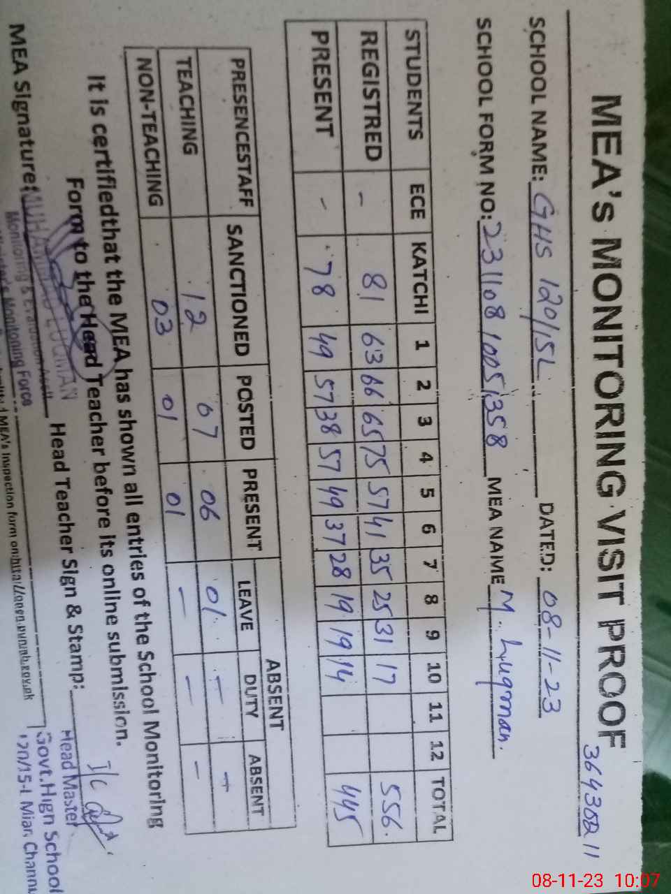| Monitoring Date: 08-11-2023 | Start Time: 08-11-2023 09:35 AM | End Time: 08-11-2023 10:09 AM | Name of MEA: Mu**** Lu**** | |