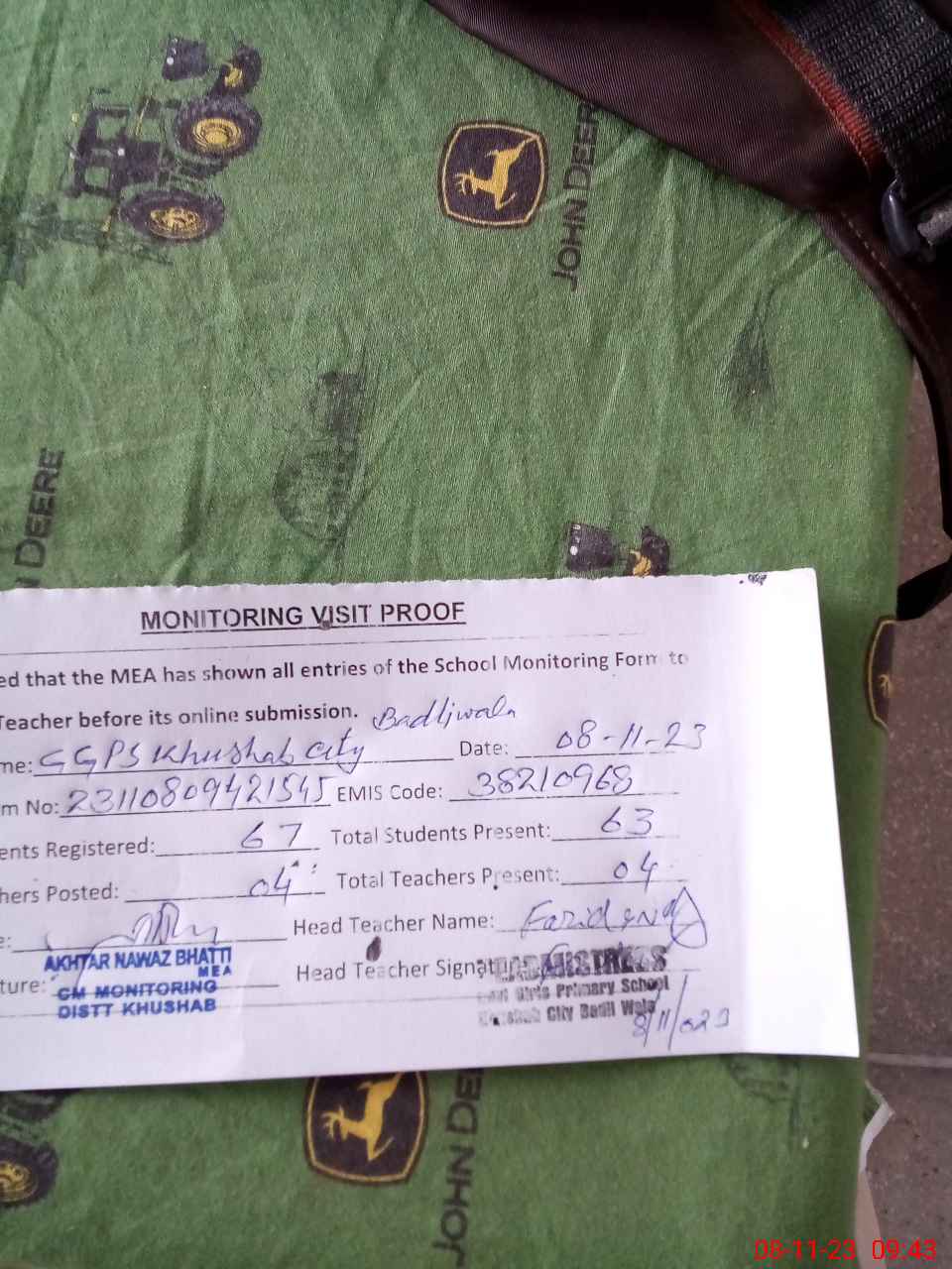 | Attendance Register | Head Teacher | MEA with School | Visit Proof |