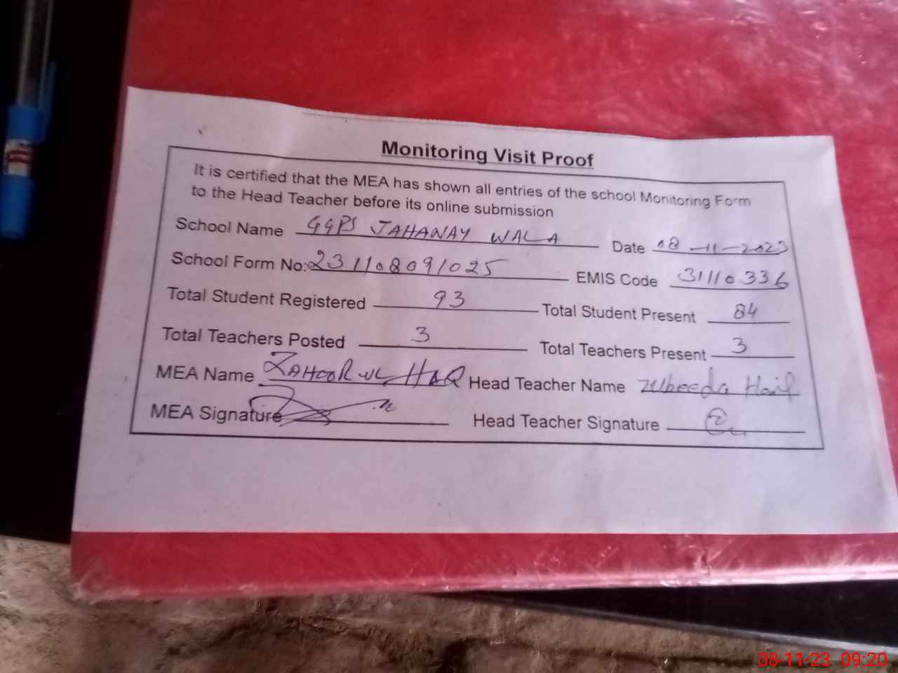 | Attendance Register | Head Teacher | MEA with School | Visit Proof |