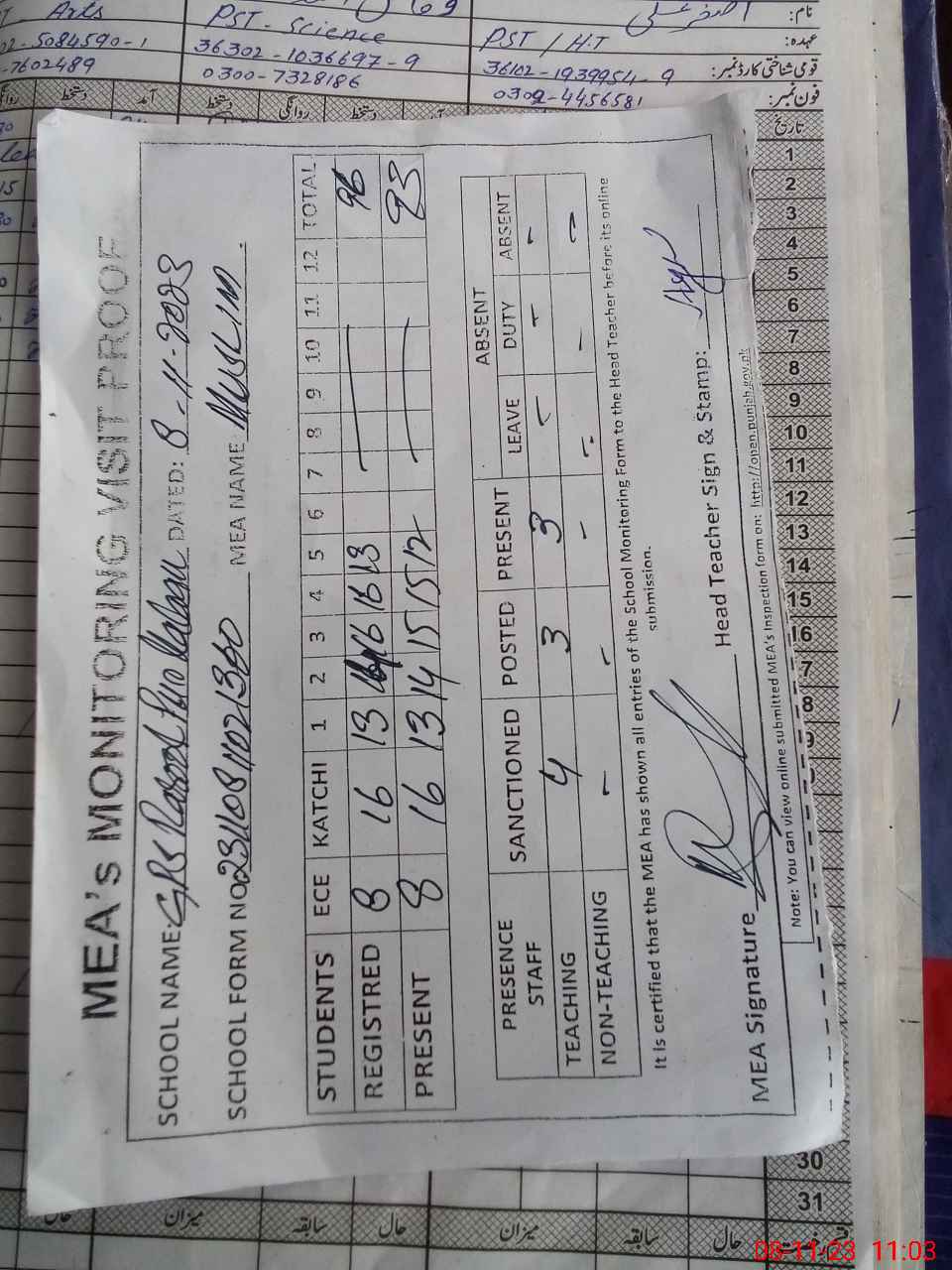 | Name: As**** Al**** Designation: (School Headmaster's/Headmistress's) PST Phone/Cell Number: 03**** |