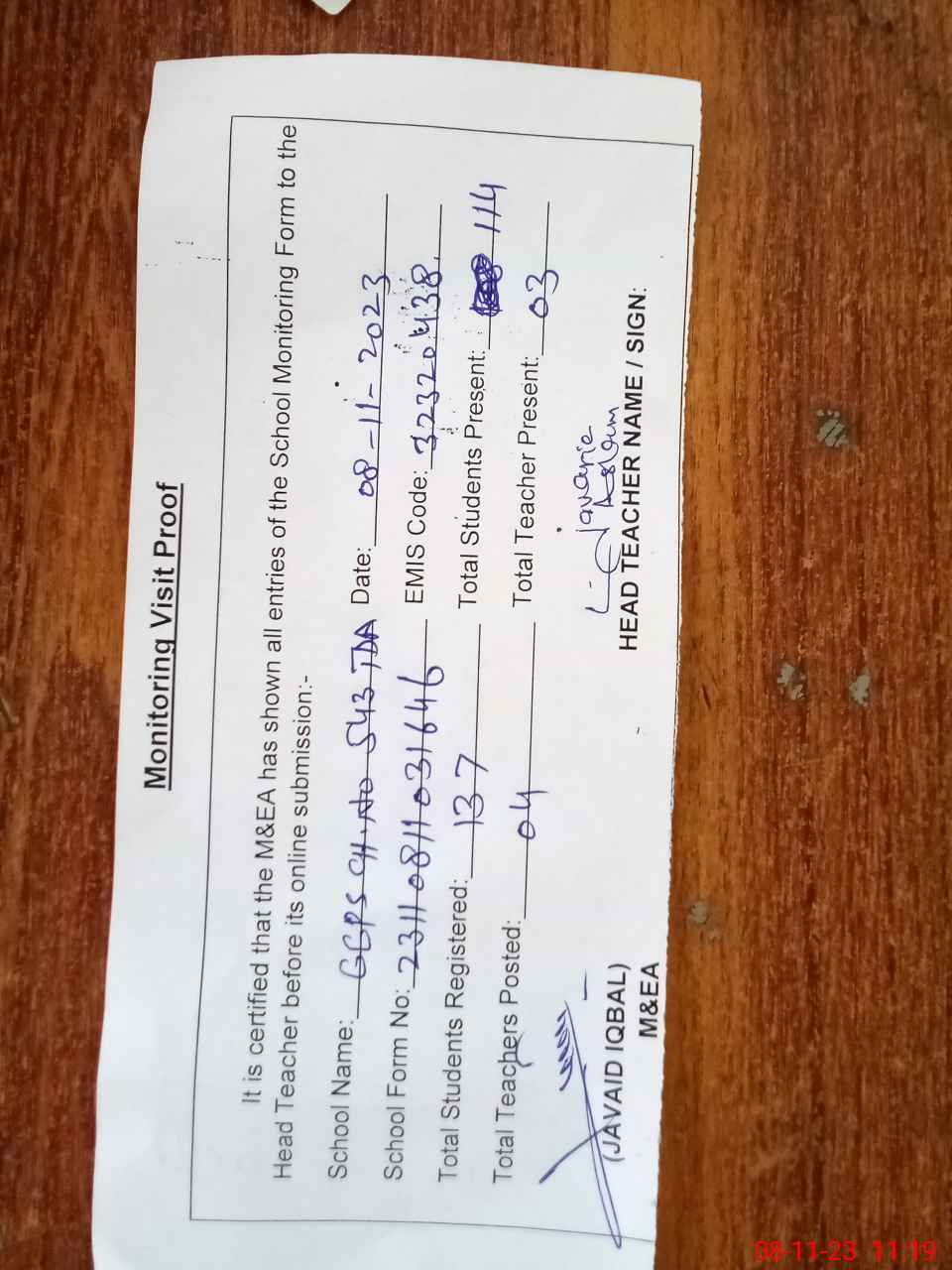 | Attendance Register | Head Teacher | MEA with School | Visit Proof |