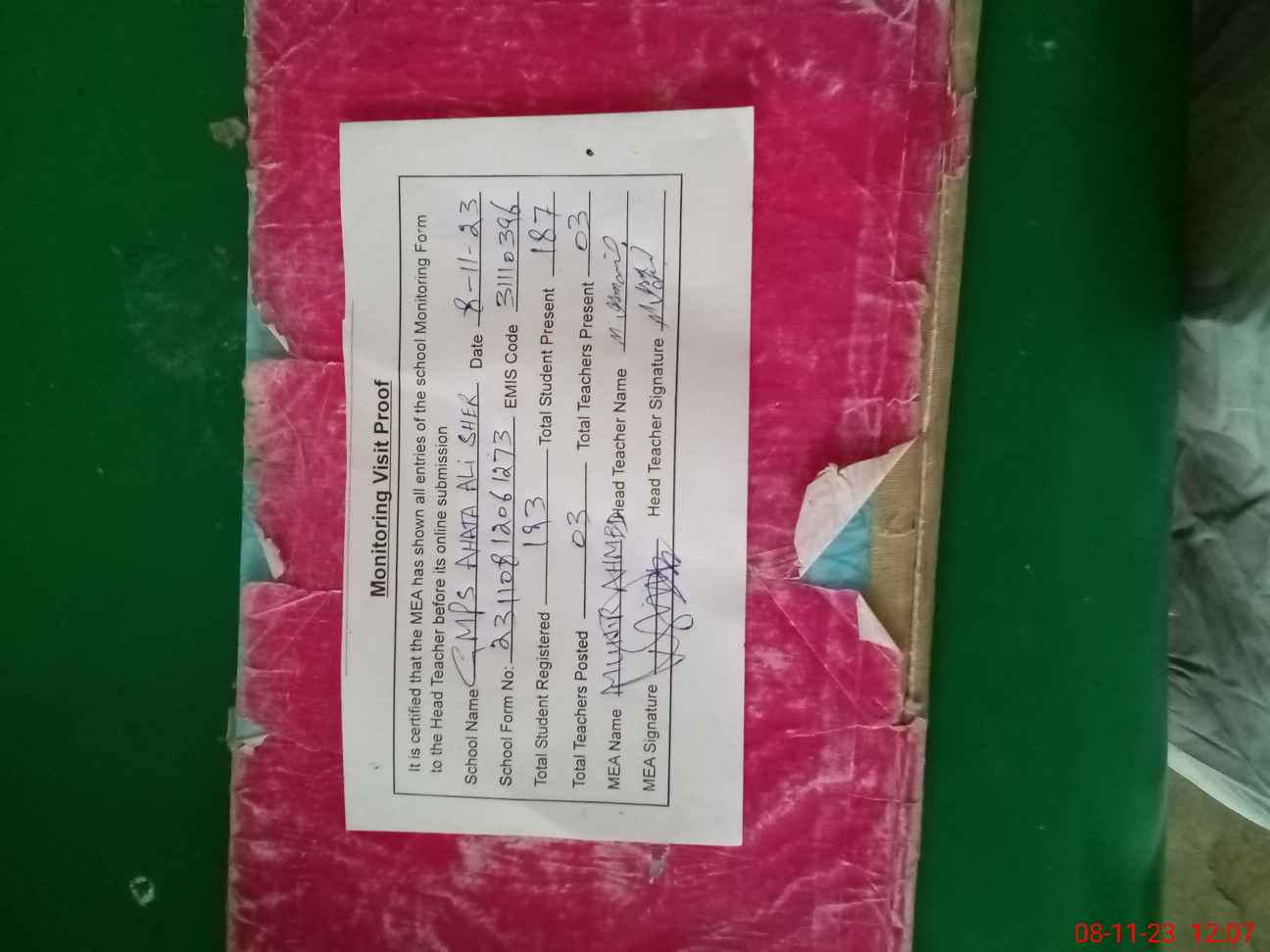 | Attendance Register | Head Teacher | MEA with School | Visit Proof |