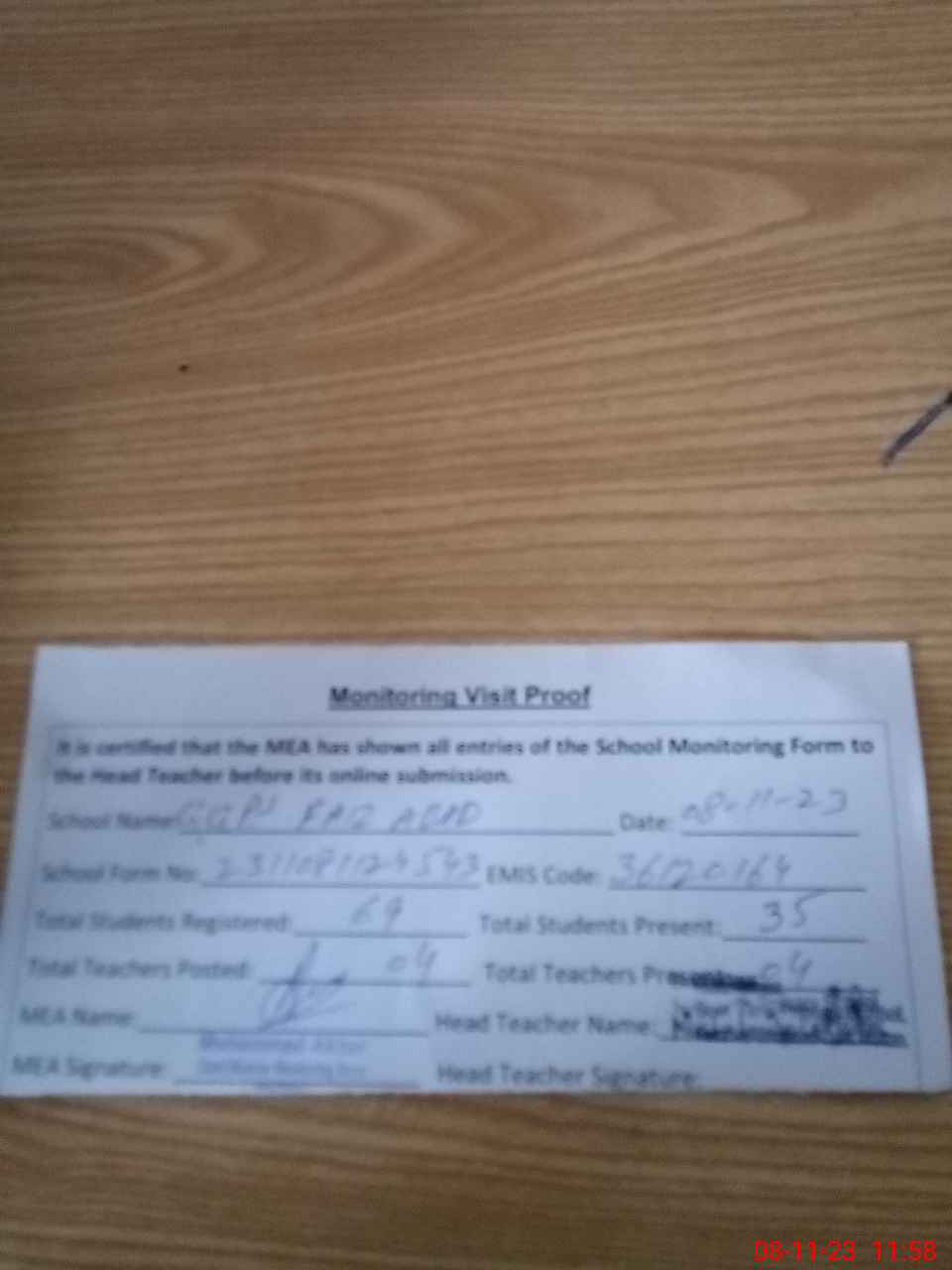 | Attendance Register | Head Teacher | MEA with School | Visit Proof |