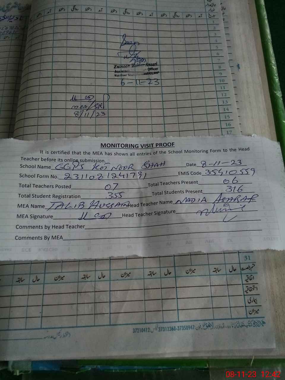 | Attendance Register | Head Teacher | MEA with School | Visit Proof |