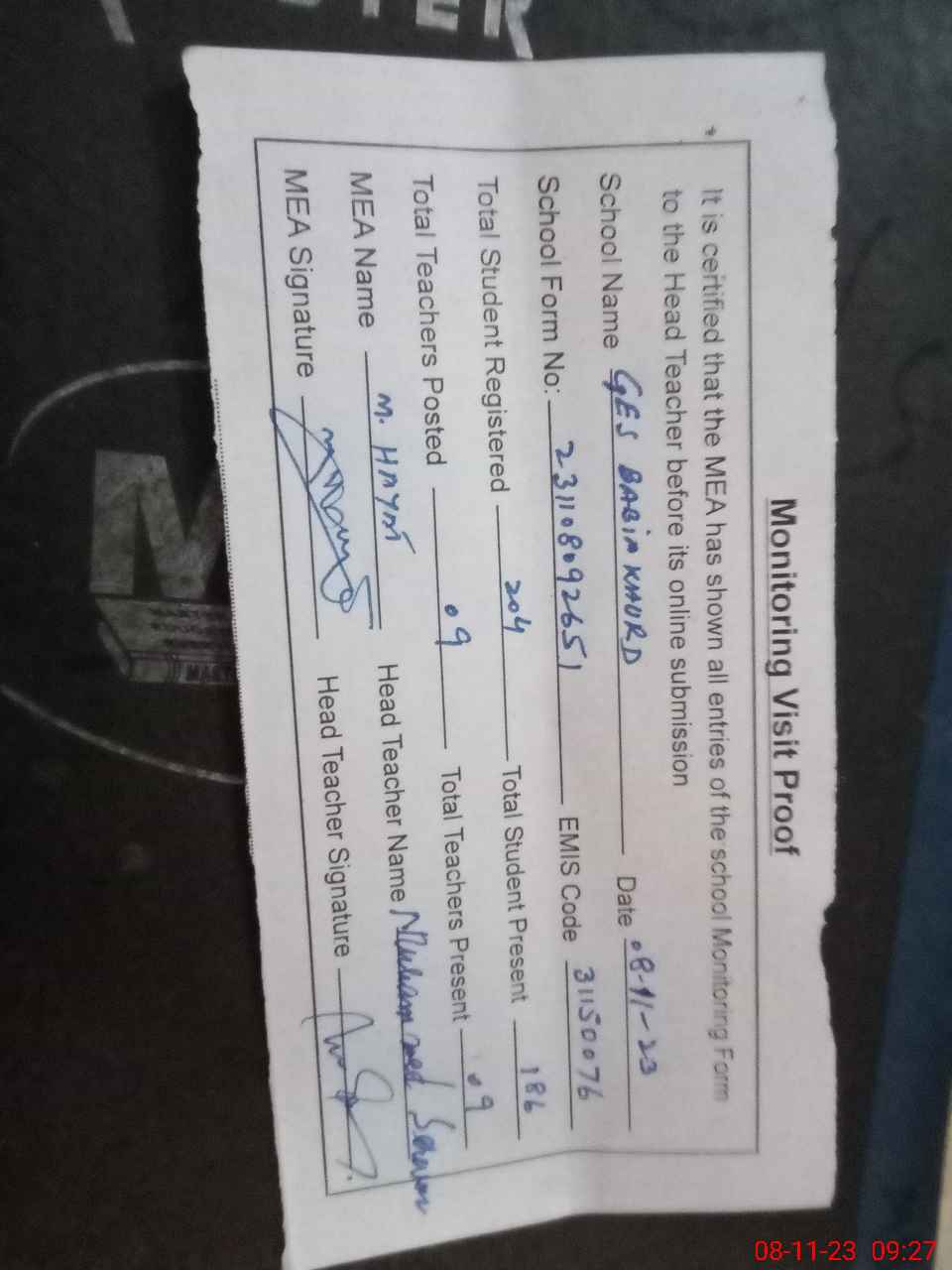 | Attendance Register | Head Teacher | MEA with School | Visit Proof |
