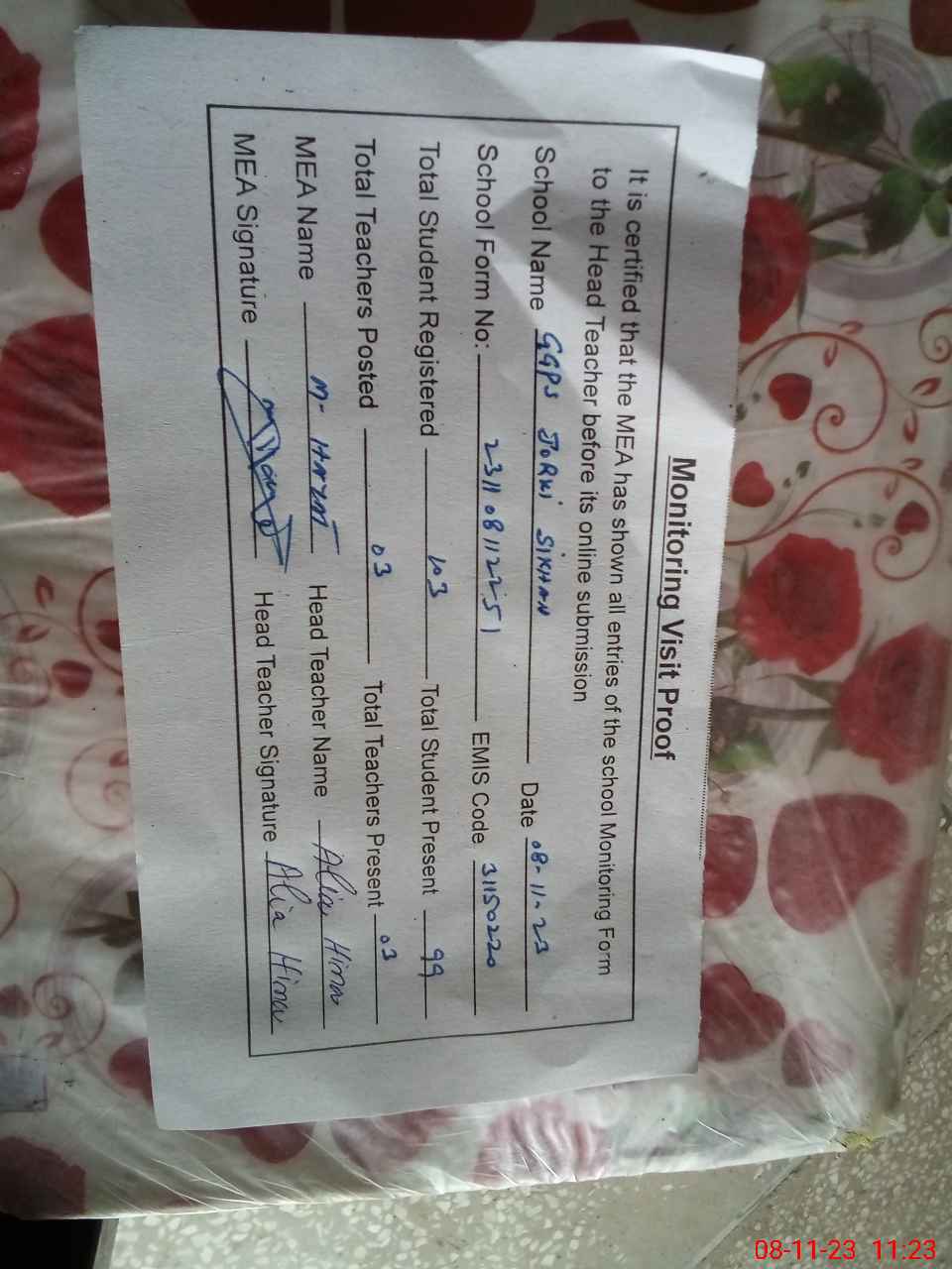 | Attendance Register | Head Teacher | MEA with School | Visit Proof |