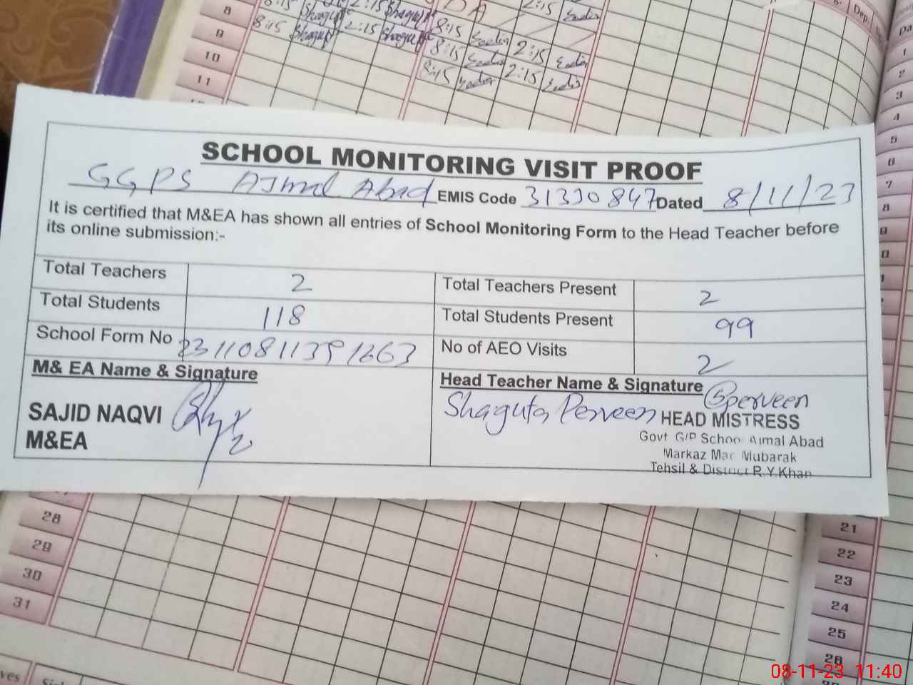 | Attendance Register | Head Teacher | MEA with School | Visit Proof |
